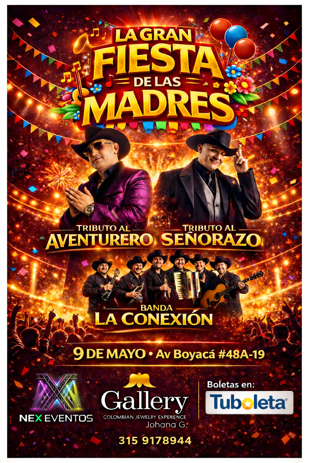 Este 9 de mayo, regálale a mamá una noche que recordará para siempre en La Gran Fiesta de las Madres, un espectáculo lleno de emoción, música y celebración en vivo en Av Boyacá #48A-19. Disfruta los mejores éxitos con el Tributo al Aventurero, el Tributo al Señorazo y la energía inconfundible de la Banda La Conexión, en un ambiente pensado para cantar, brindar y agradecer todo el amor que ellas nos dan. Celebra a lo grande, crea recuerdos inolvidables y asegura tus entradas ahora. Informes: 315 917 8944. NEX Eventos, experiencias que se viven con el corazón.