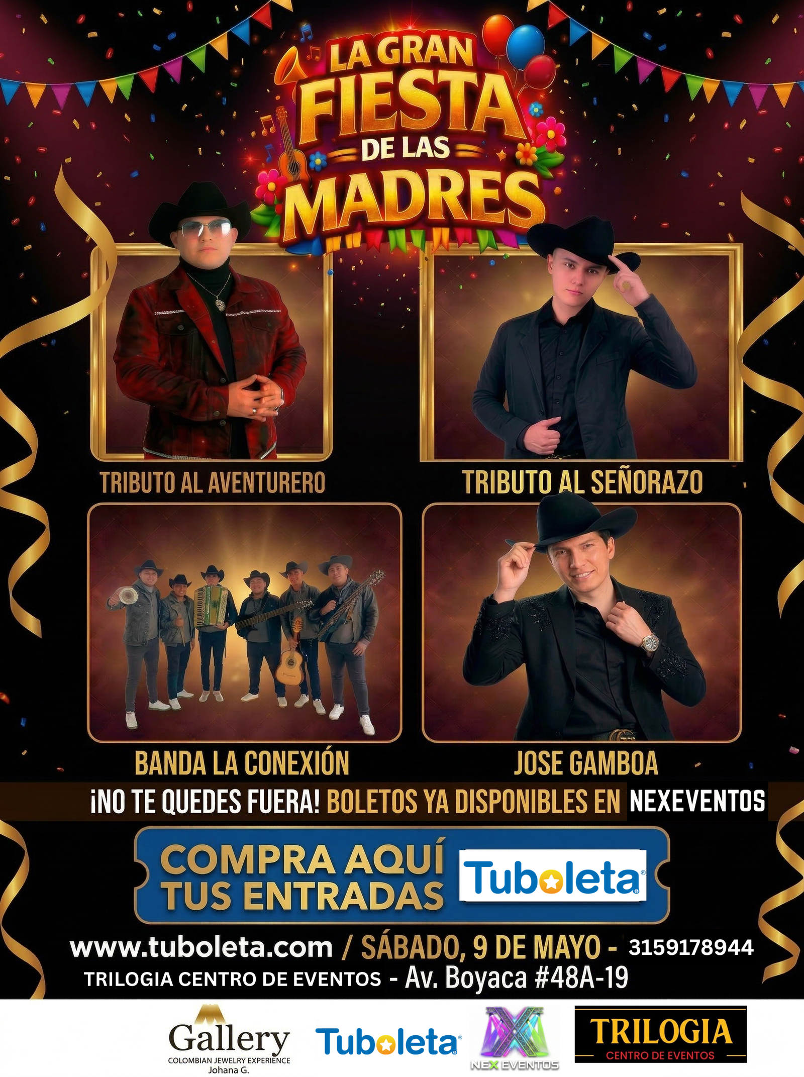 Este 9 de mayo, regálale a mamá una noche que recordará para siempre en La Gran Fiesta de las Madres, un espectáculo lleno de emoción, música y celebración en vivo en Av Boyacá #48A-19. Disfruta los mejores éxitos con el Tributo al Aventurero, el Tributo al Señorazo y la energía inconfundible de la Banda La Conexión, en un ambiente pensado para cantar, brindar y agradecer todo el amor que ellas nos dan. Celebra a lo grande, crea recuerdos inolvidables y asegura tus entradas ahora. Informes: 315 917 8944. NEX Eventos, experiencias que se viven con el corazón.